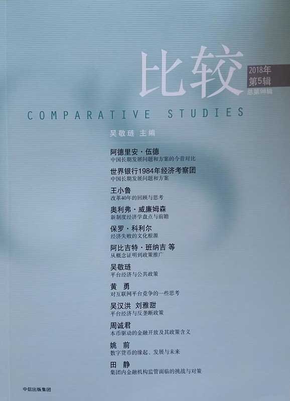 《比较》——以比较传递理念、思想和智识吴敬琏主编,中信出版社出版,2002年7月创刊,是当今中国权威的经济学连续出版物。刊物秉承“以比较传递理念、思想和智识”的宗旨,广采世界一流经济学家的最新理论和思想,有针对性地介绍国内外学术理论界对中国经济改革的方案设计、政策建议和评论。双月出刊,每年双数月份出版。