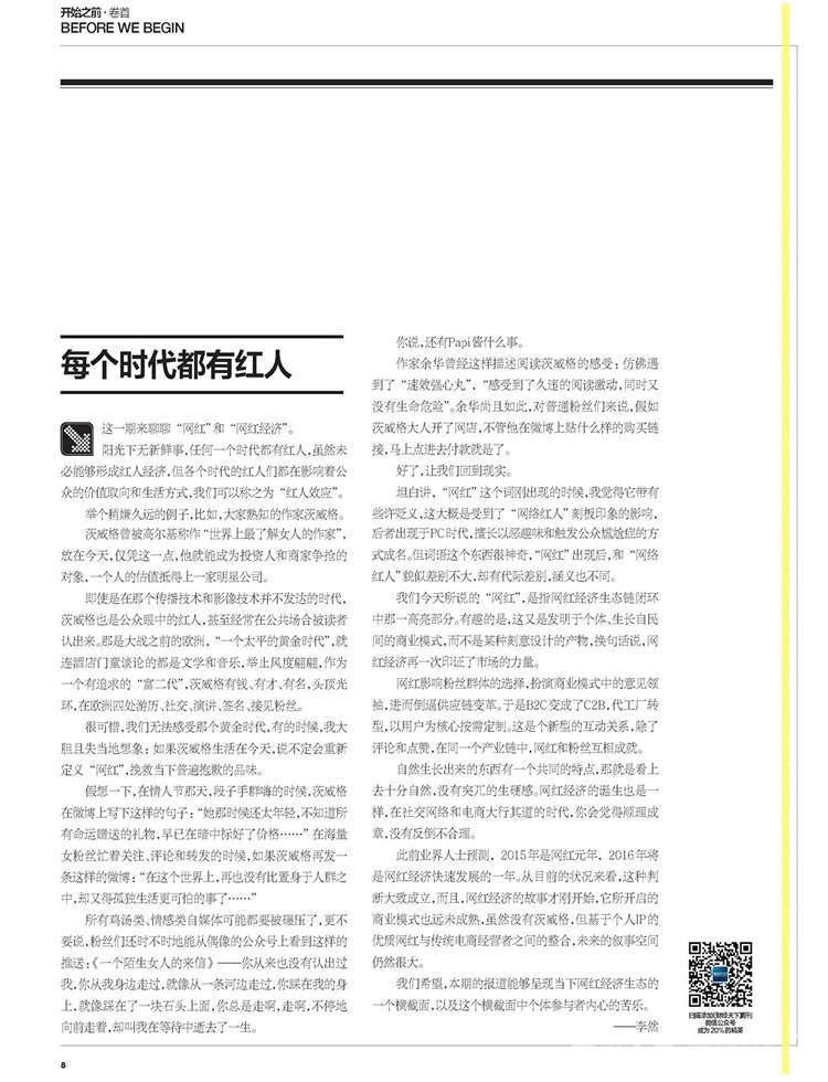《财经天下》周刊应运这一趋势而生,我们为中国最具商业好奇心,最具向上动力和最具活力的城市人群提供精良的商业报道。我们将永远与这些“寻找机会,但不寻求安稳,要成功也能承受失败”的挺胸直立的人在一起,以行动实现新“中国梦”。我们永远遵从彻底的读者立场,以读者好奇心为始,以商业洞见为终。我们摈弃无谓的坐而论道,拒绝数据和模型的肤浅解读,而是以轻松写作和时尚感的视觉来给出“下一步”的指引。
