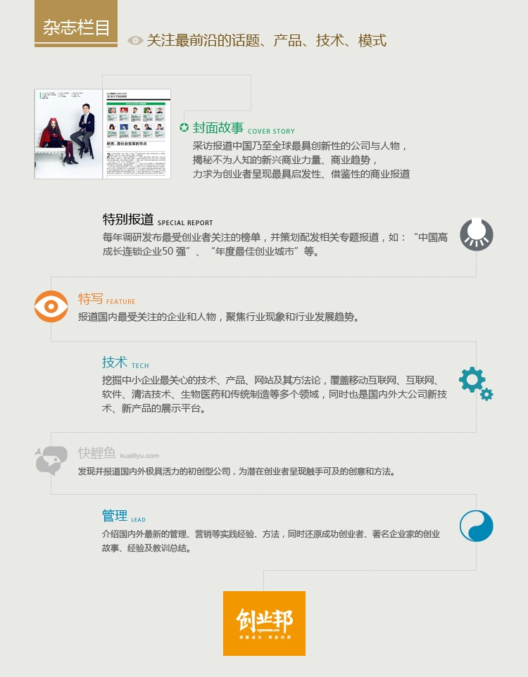 《创业邦》杂志致力于成为中国创业者的思想乐园和行动指南,为中国成长中的中小企业提供企业发展中遇到的各种问题的解决办法。