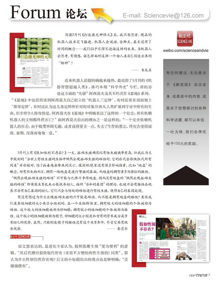 《新发现SCIENCE&VIE》 杂志以与人类自身生存密切相关的科学话题作为主打内容,文笔清新活泼有幽默感,亲和力强,介绍科普领域最新最全的潮流文化,直击全球科技人文的新潮流,力求激发读者想象力。