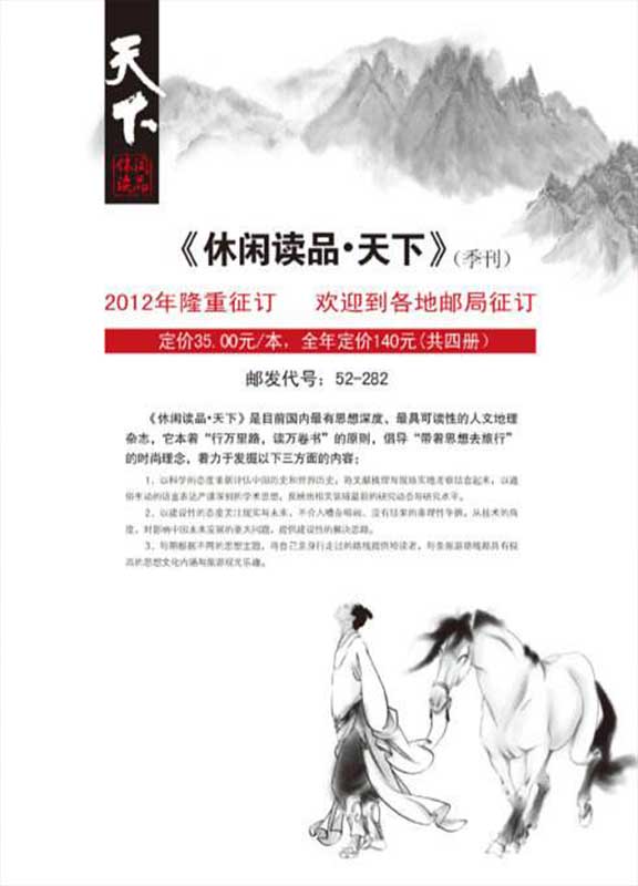 《休闲读品天下》是全国发行的大型人文地理杂志,其内容之广泛与深刻已全面突破传统的“人文旅游”概念范围,将读者带入前所未有的阅读境界。杂志特色:1、以科学的态度重新评估中国历史和世界历史,将文献梳理与现场实地考察结合起来,以通俗生动的语言表达严谨深刻的学术思想,反映出相关领域最新的研究动态与研究水平。2、以建设性的态度关注现实与未来,不介入嘈杂喧闹、没有结果的非理性争辩,从技术的角度,对影响中国未来发展的重大问题,提供建设性的解决思路。3、每期根据不同的思想主题,将自己亲身行走过的路线提供给读者,每条旅游路线都具有极高的思想文化内涵与旅游观光乐趣。4、全刊提供提供精美的现场图片,绝大多数来自本刊记者的一线拍摄,既有壮美辉煌的自然风光,也有寻常读者难得一见的内部藏品,极具资料意义和收藏价值。