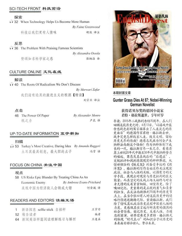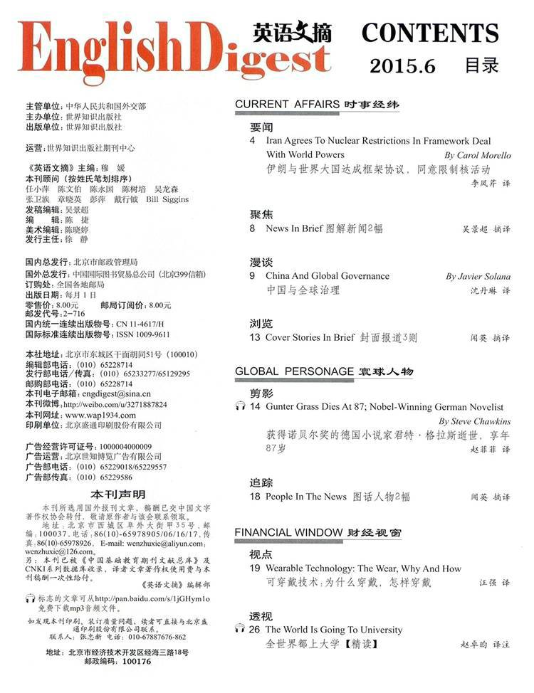《英语文摘》通过相关版块与栏目的设置,实现以理性的目光尽揽天下大事、从优秀的最新作品中学习英文。